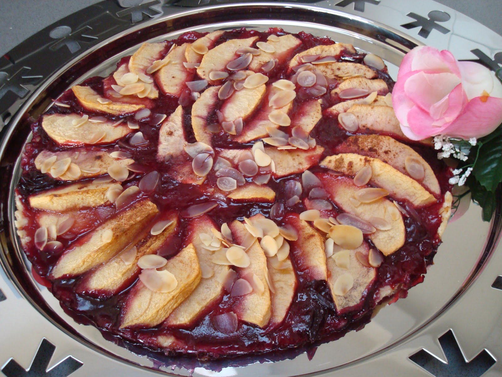 Trascorso questo tempo, distendete la pasta fino a formare un disco dallo spessore di 2- 3 cm e disponetelo in uno stampo per torta del diametro di 28 cm precedentemente imburrato. Forare ripetutamente con una forchetta la pasta e ditruibitevi sopra la marmellata di prugne (potete in realtà scegliere il gusto che più vi piace, io preparo marmellate in quantità in tutti i gusti possibili :-)). Tgaliate le mele a fettine sottili di 3-4 mm e distribuitele sopra la marmellata a ventaglio. Spolverizzate con cannella (facoltativa),aggiungete le lamelle di mandorle e terminate con dello zucchero di canna (che servirà a caramellare). Fate cuocere in forno statico a 200° per circa 30-40 minuti.