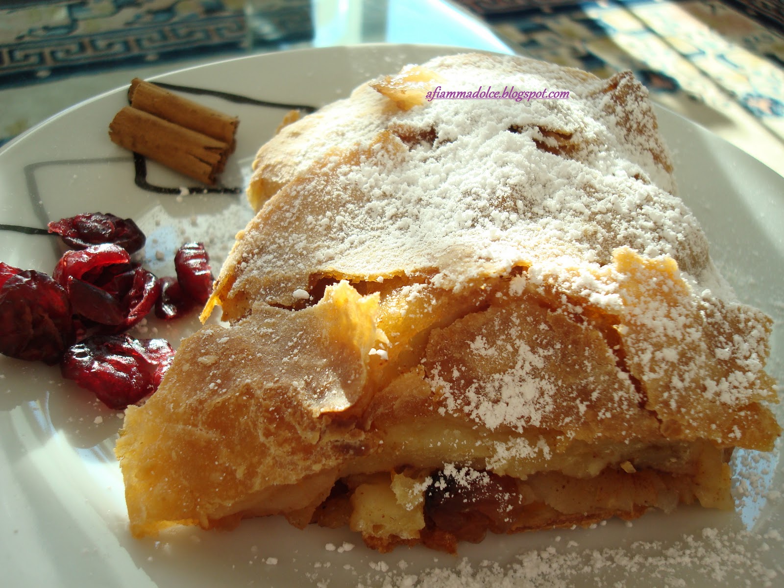 Cominciate preparando la pasta strudel cosi: Lavorate su una spianatoia tutti gli ingredienti formando un impasto elastico a cui darete la forma di una palla. Copritela con una ciotola di vetro che avrete riscaldato bagnandola con dell’acqua bollente. Fate riposare mezz’ora. A parte sbucciate le mele e tagliatele a fettina, spremete sopra il succo del limone per non farle annerire e se volete grattugiate anche la scorza per profumarle. Trascorsa la mezz’ora dividete l’impasto in 2 filoncini e stendete ciascuna pasta in un velo sottilissimo in senso verticale aiutandovi con abbondante farina. ponete sopra un velo della vostra marmellata prescelta, le fettine di mela(scolate dal limone), i cranberries, i pinoli se li gradite, spolverizzate con lo zucchero di canna, la cannella ed il pangrattato. Chiudete arrotolando su se stessa la pasta. Ponete ciascuno strudel su una teglia rivestita di carta da forno, spennellandoli con del burro fuso prima di infornare a 180° per circa un’ora in forno statico già caldo. Appena sfornati gli strudel irrorateli con altro burro fuso per evitare che la crosta indurisca.