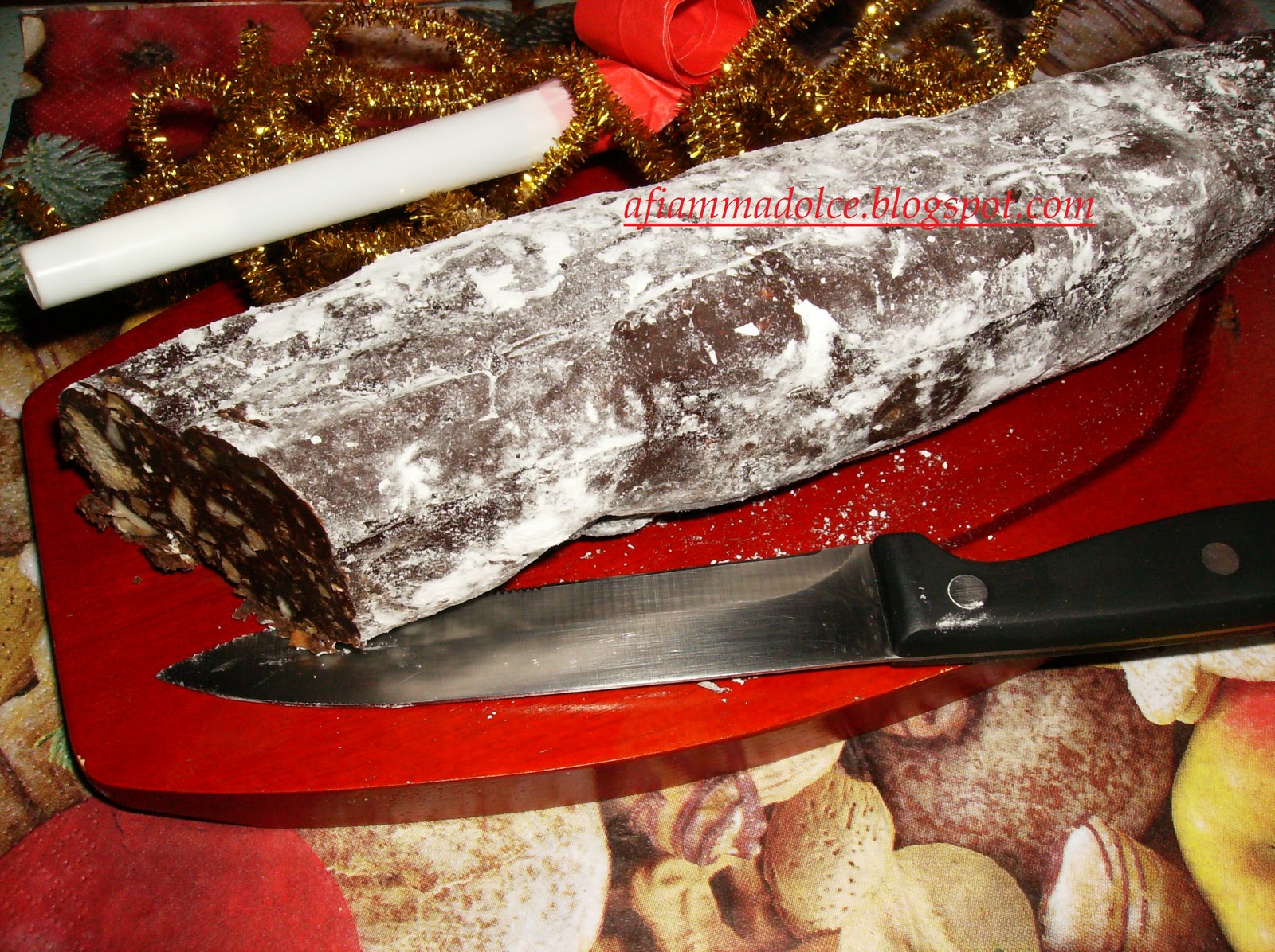 Ricettina facile facile, veloce per essere impacchettata e regalata accanto ad una bella bottiglia di liquorino fatto anch’esso in casa oppure, da unire in quei festosi cesti che si regalano a parenti e amici…La presenza al suo interno del pandoro e delle spezie tipiche del Natale fa di questo salame dolce una bella variante del classico. Se non avete tempo ma volete comunque preparare qualcosina con le vostre mani direi che è l’ideale…
