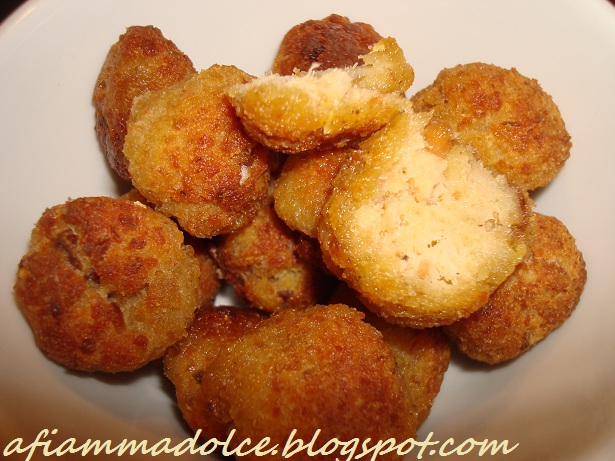 Preparate una semplice polenta, stendetela su una superficie oleata e, una volta asciutta, ricavate dei dischetti tagliandola con una formina a cerchio per biscotti. Friggete in abbondante olio.