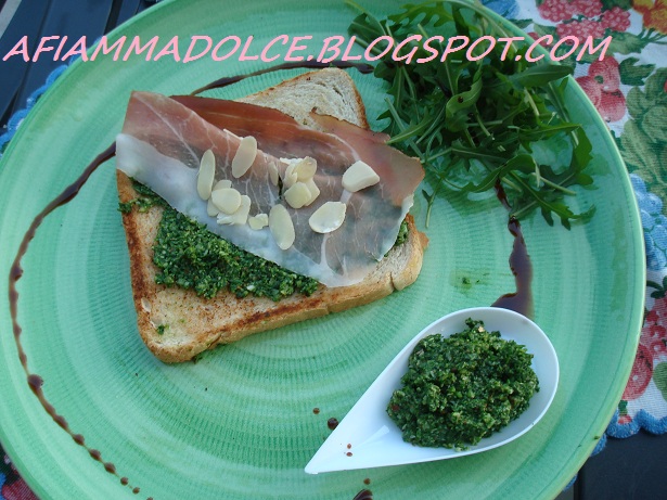 Mi piace tanto il pesto alla rucola. Normalmente ci condisco la pasta, ma quella fetta di pane con lo speck mi ha conquistata…..un ottimo aperitivo.