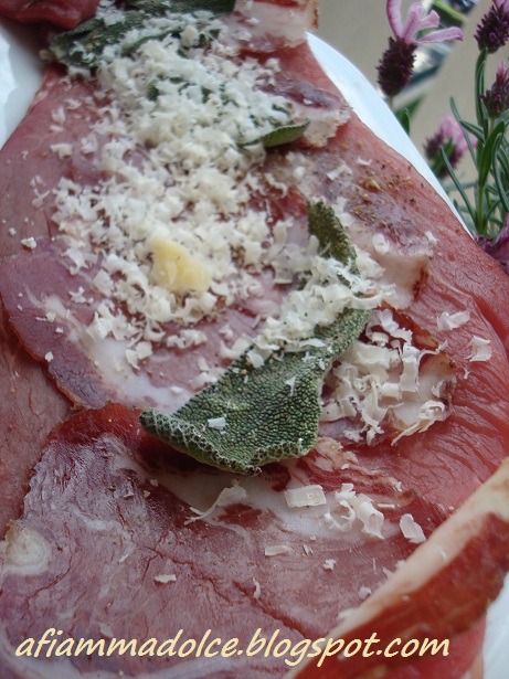 Prendete le fettine di vitello, battetele e salatele, ricoprite ciascuna di essa con una fetta di speck o pancetta, salvia, grana e pepe.