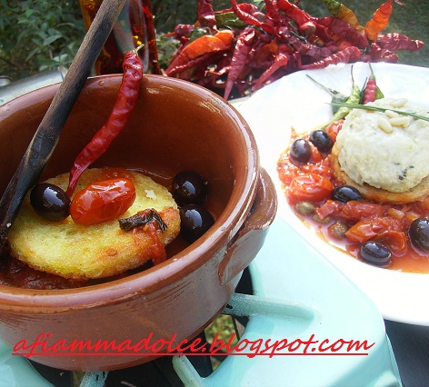 Vaccalà, con pinoli capperi e olive è già un cult in casa mia! Ma la tua preparazione "piccantosa" con il pane ritagliato, adagiato, guarnita e pure i pomodorini vesuviani… Yrma. Uno spettacolo, è!!!! Buonissima!!! Salgo io, o scendi tu????