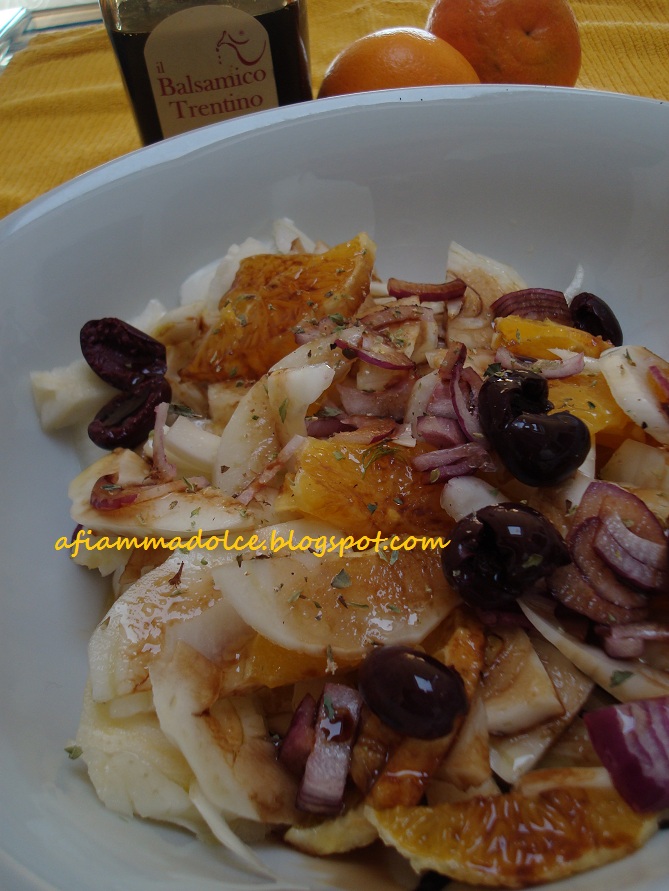 Prendete 2 finocchi e lavateli bene, tagliateli a fettine sottili. Fate lo stesso con 1 arancia bio pelata a vivo. Denocciolate delle olive nere possibilmente di Gaeta ed affettate 2 cipolle rosse di Tropea. Condite il tutto con del succo d’arancia, olio extravergine d’oliva, origano siciliano ed una grattugiata di buccia d’arancia bio (con queste arance potete permettervelo!!!!!provate;-))